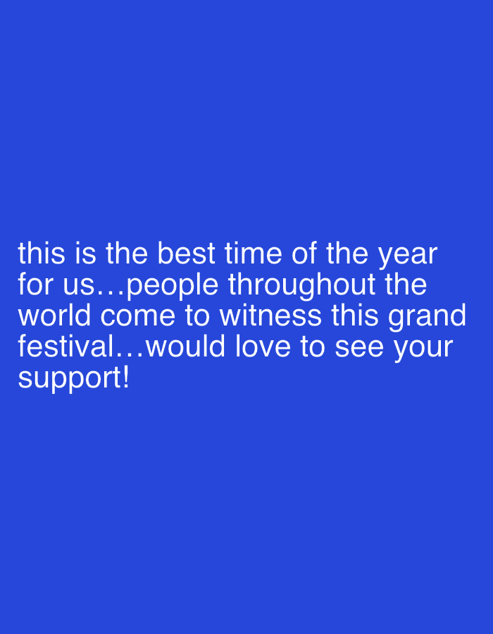 The image displays a solid, uniform blue background. White sans-serif text is centrally aligned in the lower half of the frame. The text reads: "this is the best time of the year for us...people throughout the world come to witness this grand festival...would love to see your support!". No visual elements depicting people, specific objects, actions, or direct interactions are present within the image. The environment is solely the blue background. This textual scene is associated with the city of Bidhannagar, India.