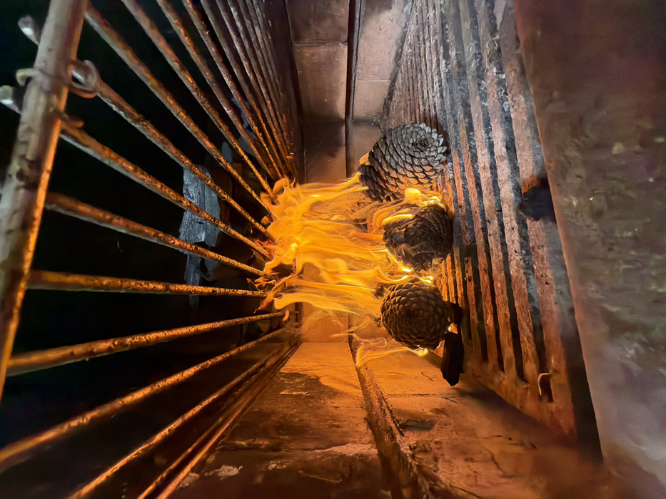 - "Within a masonry fireplace or grill structure in Vila Real, Portugal, three large pine cones are actively combusting" by FM-XZbV72, licensed under CC BY 4.0