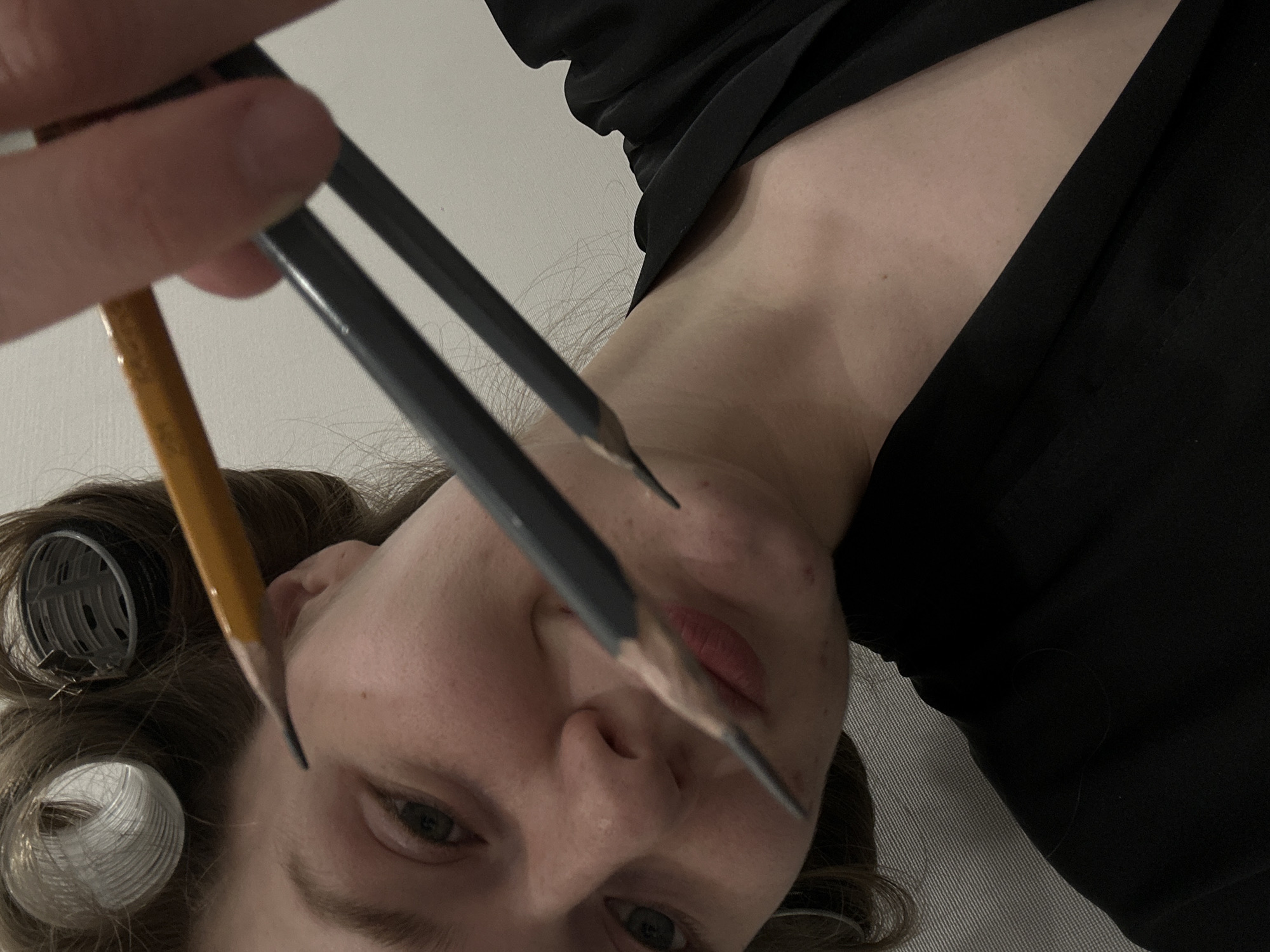 A woman holds three pencils in front of her face. She has hair curlers in her hair and is wearing a black garment. The location is not identifiable.