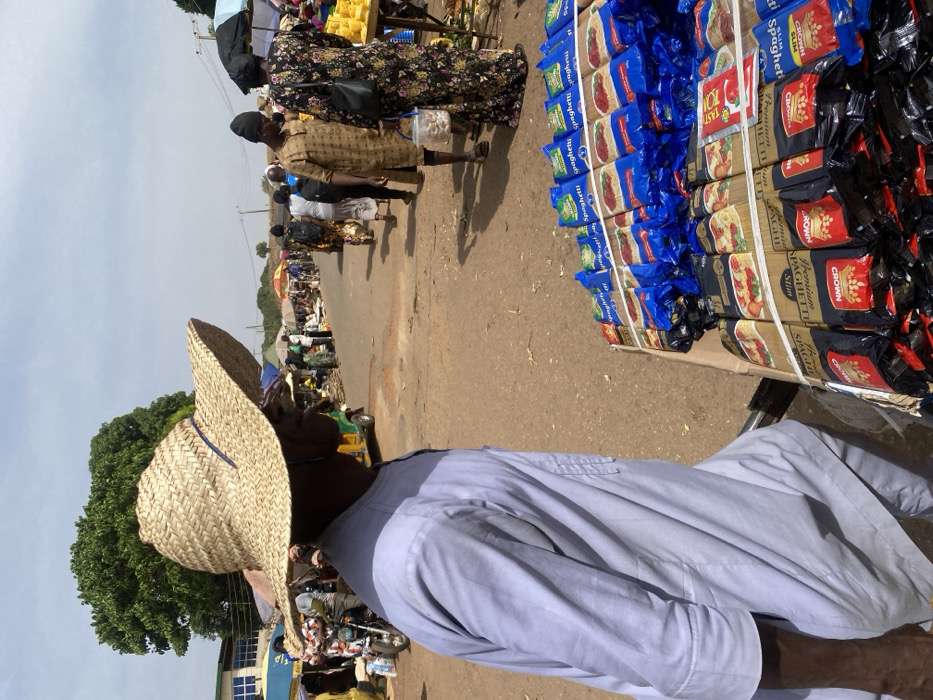 The image displays an active outdoor market scene in Kakuri Gwari, Nigeria, under a bright, clear sky