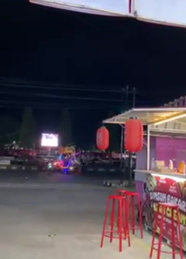 n outdoor nighttime scene with a food stall in the foreground. The stall, lit from within, sells "DIMSUM BAKAR" and "MACICI EOMWI," as visible on its signage. Two red Japanese-style lanterns hang from the stall’s awning. Three red stools are arranged near the stall. In the background, there is a road with a digital billboard. A horse-drawn carriage decorated with lights is seen moving on the road. A scooter also drives on the road. Trees are also visible in the background. The sky is dark.