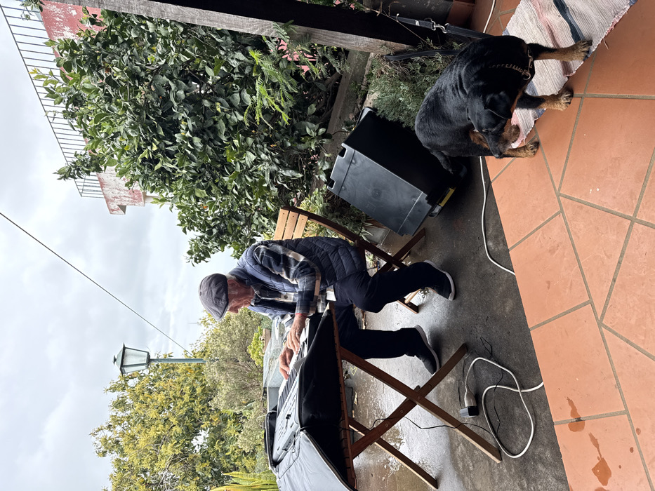 The image captures an outdoor scene in Ponta do Sol, Portugal, under an overcast sky, with the ground appearing damp or wet. An elderly Caucasian male, wearing a grey flat cap, a blue and white plaid shirt, a dark blue puffer vest, dark trousers, and dark sneakers, is seated on a light brown wooden folding chair. He is actively playing a black electronic keyboard, which rests on a matching wooden folding table. White electrical cables connected to a power plug are visible on the ground near the table's base. To the man's right, a black and tan dog, possibly a Rottweiler mix, with a studded collar, stands on a small, striped fabric rug. A black rectangular speaker or utility box on wheels is positioned on its side near the dog. The background features dense green foliage, including a large leafy tree, and a reddish-pink building wall topped with a metal railing. A dark green traditional street lamp is visible in the mid-ground. The foreground consists of terracotta-colored tiles with geometric patterns, transitioning to a darker, wet paved surface.
