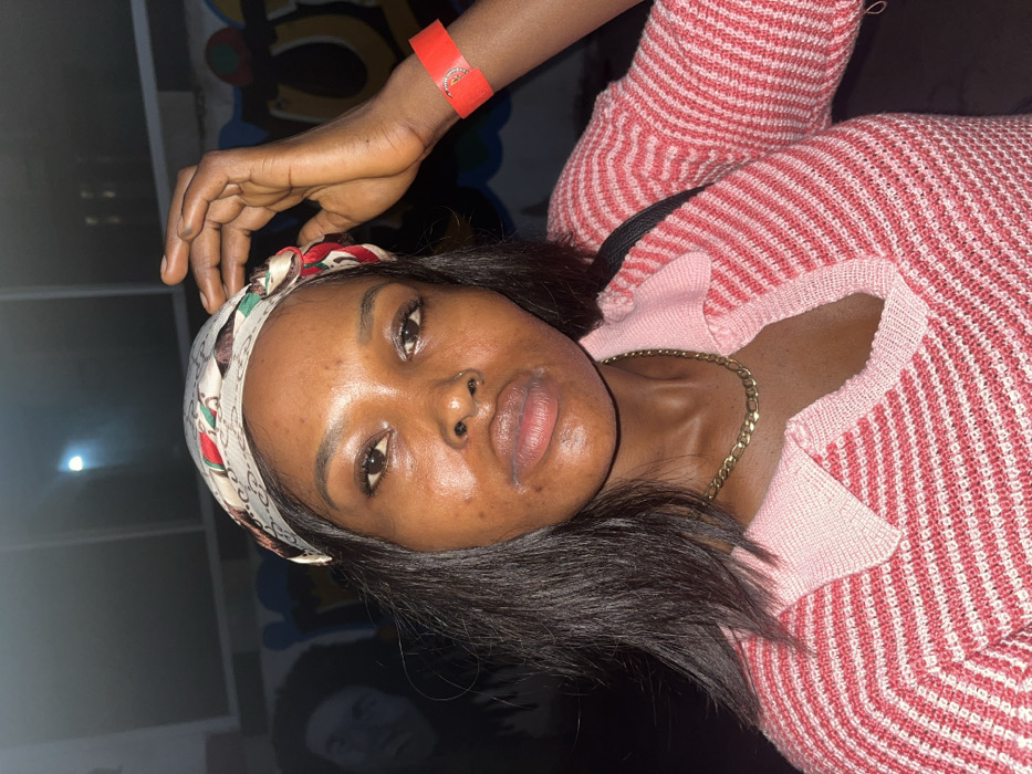 A woman poses with her face centered. She wears a patterned headscarf and a red and white striped sweater with a pink collar. A gold chain necklace is visible. She has a red wristband on her arm, which is raised above her head. The background appears dark with hints of a painted wall. Her complexion is dark with visible skin texture.