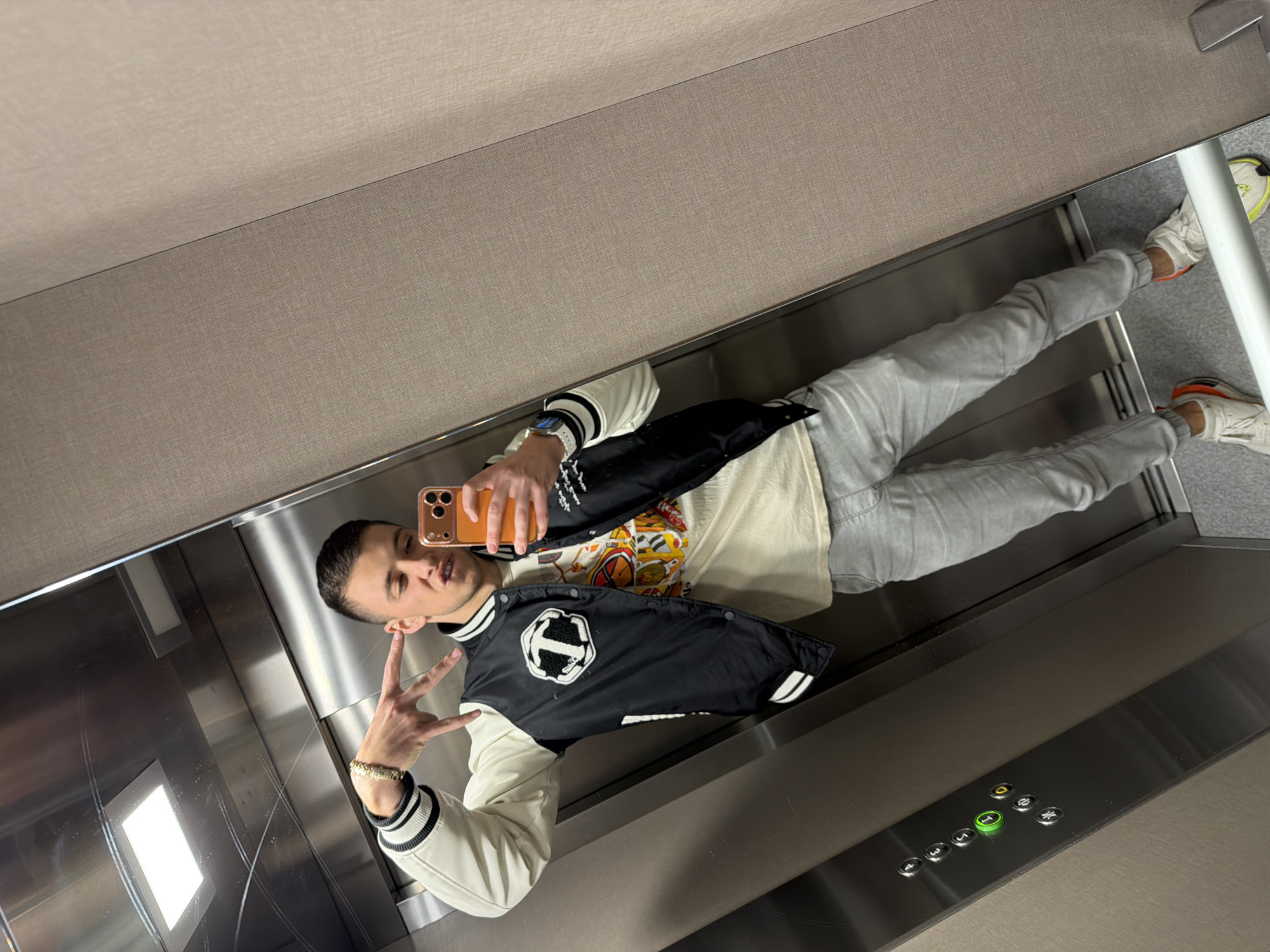 A young man is taking a selfie in what appears to be an elevator. He is wearing a black and white varsity jacket, a graphic t-shirt, and grey sweatpants with white sneakers. He is holding a smartphone with his left hand and making a hand gesture. The elevator has stainless steel walls and ceiling, with control panel buttons visible. The scene appears to be indoors. It is impossible to tell whether the picture was taken in the city of Plovdiv, Bulgaria or not from the given image.