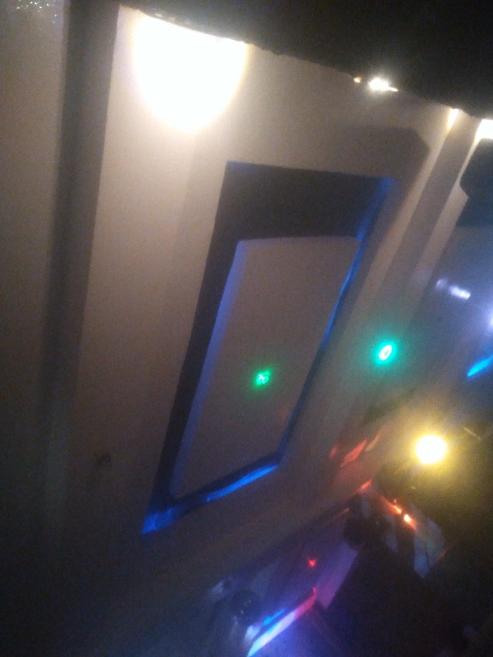 An interior overhead photograph displays a decorative ceiling structure within a premises in Jos, Nigeria. The ceiling features a multi-tiered design. A bright, warm white light source illuminates an upper-left section of an off-white surface. Centrally, a recessed rectangular panel is visible, bordered by a continuous blue LED light strip. A distinct green indicator light is present within this panel. An additional green light is observed on an adjacent ceiling element to the right. In the lower right portion of the frame, several out-of-focus colored lights are visible, including yellow, red, and blue. No individuals or specific ground-level objects are identifiable. The overall image exhibits blur.