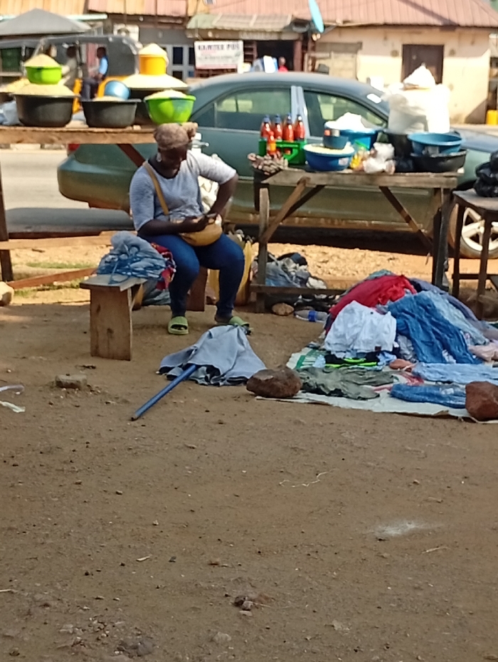 The image portrays an outdoor market scene situated on a dirt ground, adjacent to a paved road, in the city of Unknown, Unknown. An adult female, with a dark complexion and medium build, occupies a wooden bench in the foreground. She is dressed in a light-colored short-sleeved top, dark blue trousers, and light green open-toed sandals, topped with a light brown head covering. A yellow cross-body bag is slung over her shoulder. Her head is angled downwards as she manipulates a small electronic device with both hands. Adjacent to her on the wooden bench, a stack of folded clothes is visible. On the reddish-brown dirt ground directly in front, a grey umbrella, folded with its blue pole, rests near two large reddish-brown rocks. Beyond these, a selection of multi-colored apparel, including red, blue, and white garments, is spread out on a mat or tarp. To the right, a wooden table serves as a display for various goods: multiple bottles of red or orange liquid are arranged in a green rack, alongside plastic bowls filled with white granular material, and other assorted items. Partially obscured behind this table is another display holding black bags or containers. In the background, a dark green sedan is positioned on a paved road, partially hidden by market structures. Above the leftmost market stall, several large black pots are topped with brightly colored plastic bowls, some containing yellow or green granular substances. Further in the background, buildings with reddish-brown roofs and a visible satellite dish complete the streetscape under bright, natural lighting.