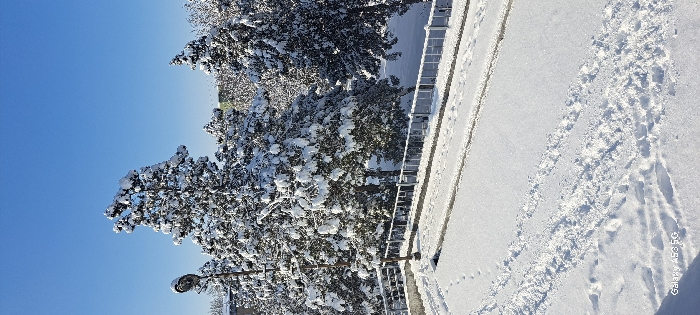Snow-covered trees line a sidewalk. Fresh footprints dot the snow-covered ground. A metal railing separates the sidewalk from the trees. A street lamp stands near the trees. The sky is a clear, bright blue. The image has been rotated counterclockwise.