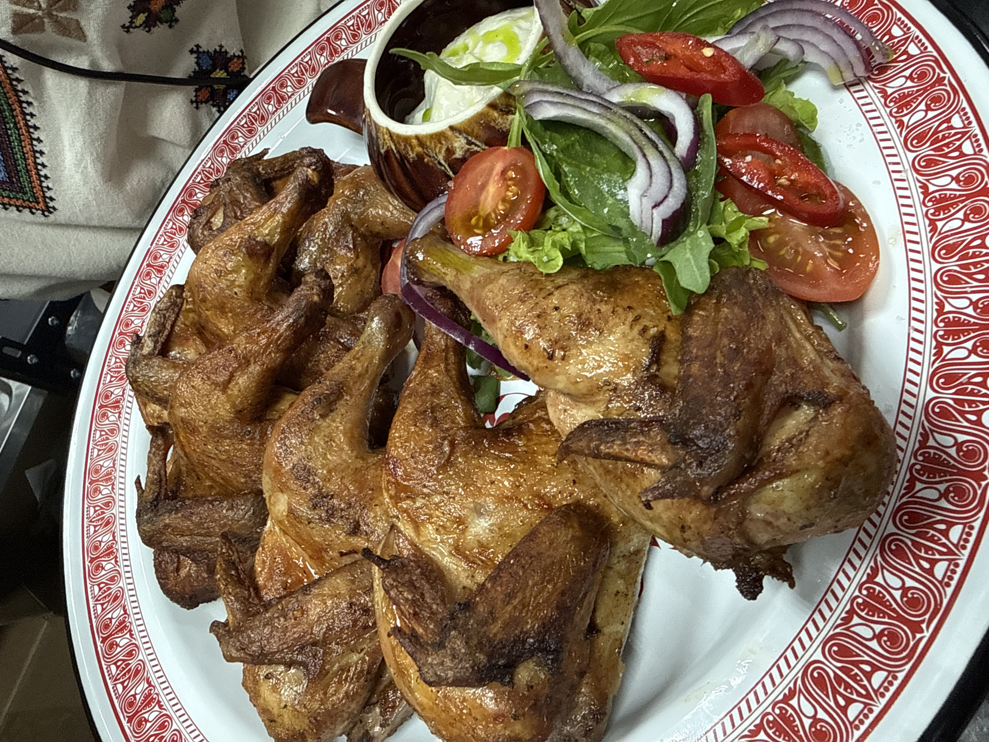 A close-up shot presents a platter laden with what appears to be roasted quail. The quail are arranged in a pile, their skin a rich, golden brown color. Adjacent to the quail is a small bowl containing a creamy, white substance, possibly cheese or a sauce. A fresh salad comprised of arugula, sliced tomatoes, and red onion rings adds a vibrant touch to the presentation. The platter itself is white with a red, ornate patterned rim. A piece of embroidered fabric is visible in the upper left corner of the frame. The location is specified as Donetsk, Ukraine, but this detail is not visually verifiable within the image.