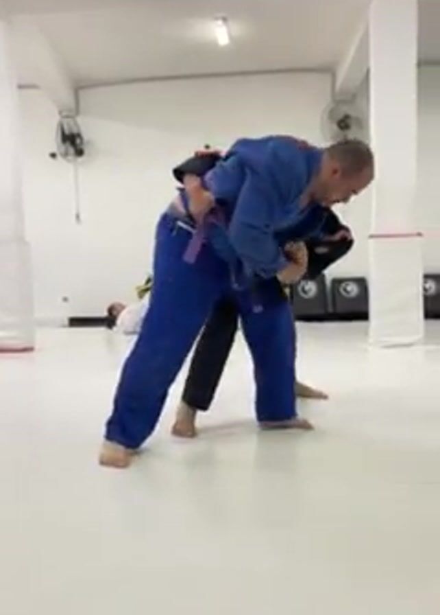 Two individuals practice what appears to be a grappling martial art in a brightly lit, minimalistic training space. One individual is wearing a blue gi with a purple belt, while the other wears a black gi. The person in the blue gi executes a backward throw, lifting the person in the black gi off the ground using their hip and upper body strength. The floor is white, and several training mats are visible in the background, along with some wall-mounted fans and black padded objects. In the distance, a third individual is lying on a mat.