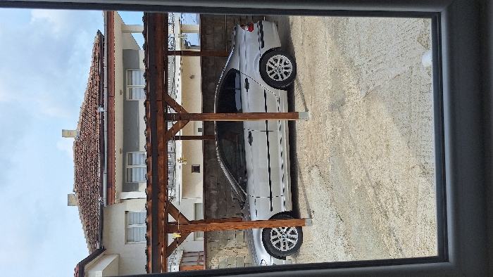 The image depicts a residential scene in Dolni Chiflik, Bulgaria, viewed through a window frame. In the midground, a silver four-door sedan, identifiable as a BMW E46 3-series, is parked on a concrete surface beneath a wooden carport. The carport consists of brown timber posts and crossbeams; decorative elements, possibly star-shaped, hang from the structure. A low, grey stone wall runs behind the vehicle. In the background, a multi-story house with cream-colored walls and a terracotta-tiled gabled roof is visible. The roof features two chimneys. The house has several windows fitted with external roller shutters or blinds, some partially open. The sky above is partly cloudy. No individuals are present within the frame.