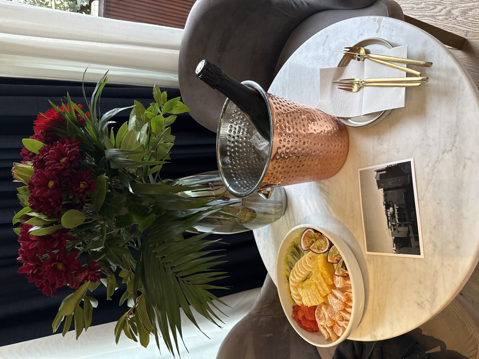 The image displays an interior scene, likely within a hotel room or suite in Athens, Greece. A round, white marble-topped table serves as the central focus. On the table, a tall glass vase holds a large bouquet of deep red chrysanthemums mixed with various green leafy foliage, including palm fronds. To the left, a white oval bowl contains an arrangement of sliced fresh fruit, specifically visible are grapefruit, pineapple, banana, kiwi, mandarin oranges, and passion fruit. To the right, a hammered copper-colored ice bucket with a silver interior holds a dark-colored bottle, presumably sparkling wine or champagne, chilling in ice. Adjacent to the bucket, a small silver plate holds a folded white napkin and two golden-colored forks. A black-and-white photograph, approximately 4x6 inches, is placed on the table, depicting a multi-story building characterized by a distinct brutalist architectural style. This building is identifiable as Athens Tower 1, situated in the Ampelokipoi neighborhood of Athens. In the background, dark blue drapes are partially obscured by sheer white curtains, offering a glimpse of an outdoor balcony area with vertical wooden paneling and some greenery. Portions of two upholstered chairs, light grey in color, are visible on either side of the table.