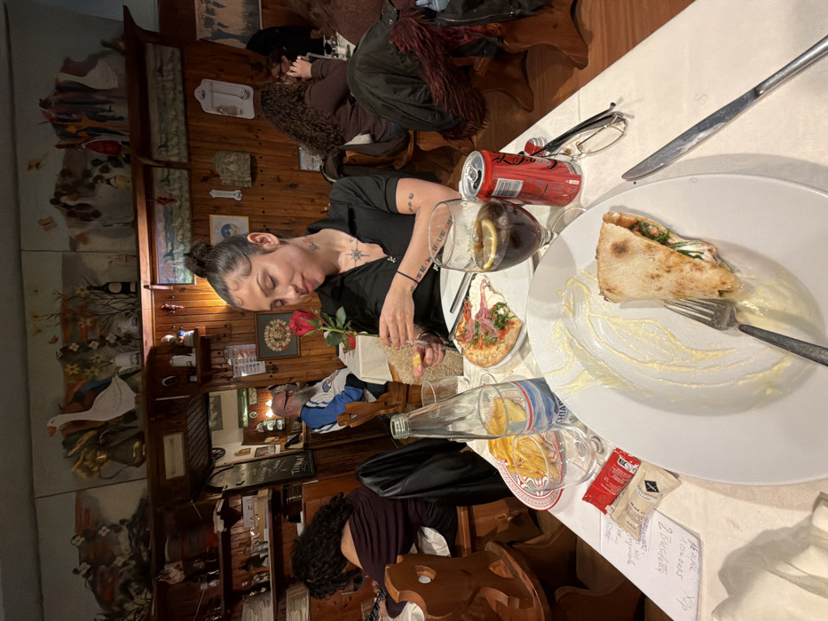 A restaurant scene features a woman resting her head near a red rose. The table is set with a partially eaten pizza, a glass of red wine, a can of Coca-Cola, and a water bottle. Other patrons are present, including one with curly hair and another in a blue and white jersey. The interior showcases wood-paneled walls adorned with paintings and decorative items. A handwritten bill is visible on the table.