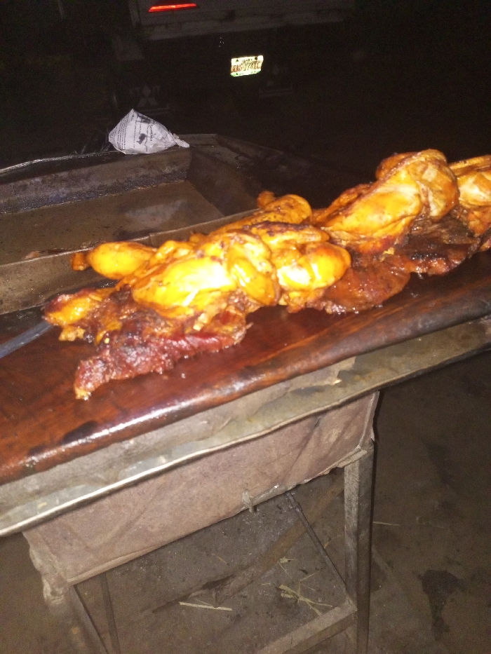 Grilled meat, chicken, and other foods sit on a wooden cutting board. The board is on top of a metal table, which is covered with a worn, tan fabric. The table is in a dimly lit outdoor setting. In the background, there is a car with its taillights on and a license plate that is visible. There is also crumpled paper, probably containing leftovers.