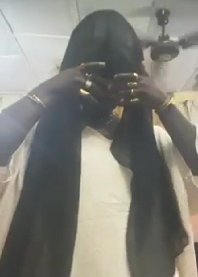 A person in a white top is shown from the chest up, donning a long, black, transparent scarf or veil over their head and face. They use their hands, which are adorned with multiple rings and a gold bracelet, to adjust the scarf. The setting appears to be an indoor room with a ceiling fan and a door in the background.