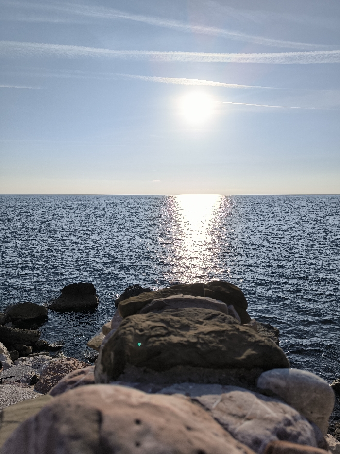 This image displays a coastal scene in Bar, Montenegro, captured from a low vantage point near a rocky shoreline or breakwater. The foreground is dominated by a formation of irregularly shaped rocks, varying in size and color from dark brown and grey to reddish-brown, extending into the choppy dark blue water on the left. A small, bright green circular artifact is visible on the surface of a prominent, textured dark brown rock in the mid-foreground. Beyond the rocks, the dark blue sea stretches to a flat horizon line that bisects the image. The sun, appearing as an intense white circular light source, is positioned in the upper-mid sky, slightly right of center. This low-angle sun casts a wide, shimmering path of direct light across the water, extending from the horizon towards the viewer. The light blue sky above is clear, except for several thin, white contrails streaking horizontally across its upper portion. No individuals, man-made structures beyond the rocks, or discernible activities are present.