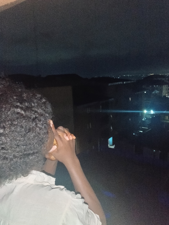 The image depicts a nighttime scene in Onitsha, Nigeria, viewed from an elevated position. In the left foreground, a person with dark, tightly curled hair is seen from behind and over their right shoulder. They wear a light-colored, possibly off-white, collared shirt with ruffled detailing. Their hands are clasped together near their right temple, with fingers intertwined, one finger pointed upward. The person appears to be observing the distant urban landscape. The midground features dimly lit building structures situated below the vantage point. A distinct bright blue light emanates from a window in one of these buildings, and a prominent horizontal lens flare extends across the frame, originating from a light source to the right. Various small, scattered artificial lights are visible in the surrounding area. The background displays a sprawling urban area with numerous distant city lights, suggesting a populated zone. Silhouettes of hills or elevated terrain are faintly visible against the dark, overcast night sky above the city horizon.