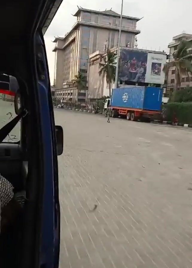 A blue vehicle travels on a grey brick-paved road. The view is from inside the vehicle, looking out the passenger-side window. A tall, multi-story building is on the right. There is a large billboard showing a group of people, with "Hennessy" written on it. A blue shipping container on the back of a truck is parked near the billboard. The container has the letters "COSCO" on it. A person walks alongside the truck. Other buildings are in the background. The sky is overcast.