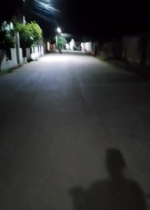 The video, taken at night, shows a street lit by intermittent streetlights