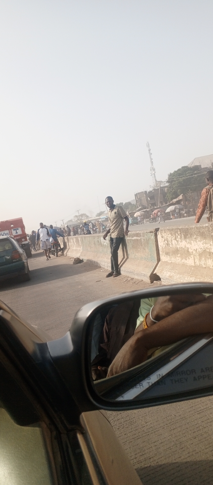 This image captures a street scene in Iddah, Nigeria, from the perspective of a vehicle's passenger side. The foreground is dominated by the vehicle's side mirror, reflecting part of the occupant's arms wearing a light green sleeve and wristbands, along with a blurred reflection of the vehicle's interior. A concrete road barrier runs diagonally from the lower left to the upper right, separating the viewer's immediate road from the opposite lane and a busy roadside area. Standing prominently on the far side of this barrier, slightly right of center, is an adult male with dark skin, wearing a light-colored striped polo shirt and dark pants with sandals. He is facing generally towards the camera, with a direct gaze. His shadow is cast long on the barrier. Beyond the barrier, a multi-lane road is visible with traffic. A red truck with "T" and "56 KM" markings is partially visible on the left. Several individuals are walking or operating motorcycles. Further back, a dense collection of people and structures suggests a market or commercial area. Multiple street vendors' umbrellas are visible among the crowd. A tall, white cellular communication tower stands in the distant background, against a hazy, bright sky. Other buildings, some under construction or in disrepair, are also visible in the background. The overall environment appears active and urban.