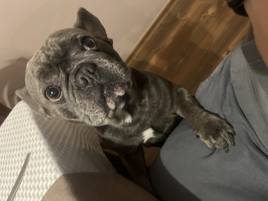 An indoor scene in Vratsa, Bulgaria, depicts a brindle French Bulldog with a gray-blue coat and a small white patch on its chest. The dog's head is tilted slightly upward, its dark, round eyes focused towards the viewer. Its pinkish muzzle area shows visible wrinkles. One of the dog's front paws rests on the upper leg of an unseen individual, whose leg is clad in light blue fabric. The immediate background to the left features a polished wooden surface. To the right, a light-colored, textured surface, possibly part of a chair or tablecloth, is visible, along with a narrow metallic object, consistent with cutlery.