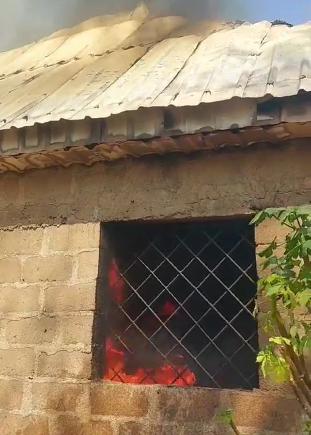 A low-angle shot shows a single-story brick building with a corrugated metal roof on fire. Black smoke billows from the roof. Flames are visible through the bars of a window. A second window has a partially open wooden shutter. A small tree is visible near the first window. The sky is visible and appears blue.