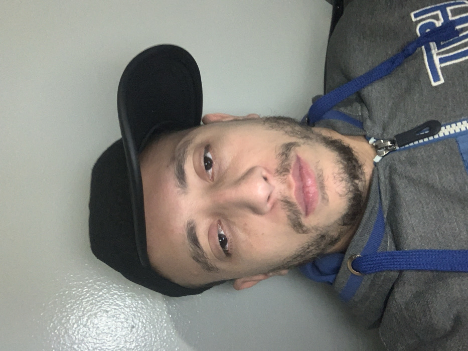 A man with medium-brown skin, a stubbled beard, and brown eyes is facing the camera. He is wearing a black baseball cap and a gray and blue hooded sweatshirt. The zipper of the sweatshirt is partially zipped. The background is a plain, light-colored wall. The image appears to be rotated to the left.