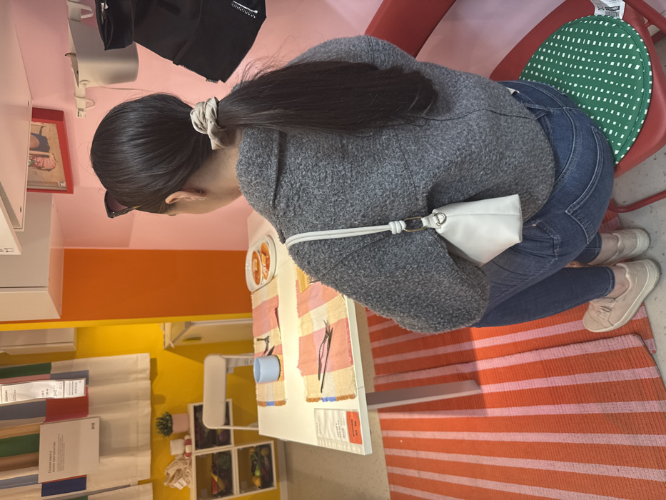 This image depicts an interior scene within an IKEA store, staged as a dining area. The primary subject is an individual, viewed from behind, seated at a white rectangular dining table. The person has dark hair tied back in a ponytail with a light-colored scrunchie, and dark sunglasses are perched on top of their head. They are wearing a grey textured jacket, blue jeans, and light pink slip-on shoes. A white shoulder bag with a gold ring detail hangs from their right shoulder. They are seated on a red chair equipped with a green, white-dotted circular cushion. The white table is set for two with two pink and orange striped placemats. Each placemat has a set of black cutlery (fork and knife). A light blue mug rests on the left placemat. The right placemat has a white plate holding two round, orange-colored food items. The environment features brightly colored walls: yellow on the far left, orange in the mid-background, and light pink on the right. In the background to the left, white wall-mounted shelving and display units are visible. These displays include hanging fabric swatches in various colors with "IKEA" and "DIMSLÅV" branding and price tags. Below these, modular white shelves contain items such as plants, woven bags, and produce. A white folding chair is positioned further back. The right background features white wall-mounted cabinets above the pink wall, a red-framed picture, white wall-mounted organizational containers, and a black bag hanging from a hook. The floor is covered with an orange and pink striped rug.