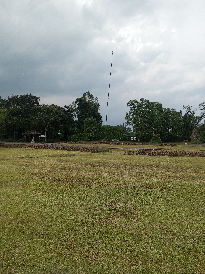 A wide expanse of green grass occupies the foreground, leading to a strip of colorful flowers and low shrubbery in the middle ground. Beyond this, trees and foliage form a dense backdrop. A tall, thin structure, possibly a communication tower or pole, rises above the trees. The sky is overcast with grey, heavy clouds. A small gazebo-like structure is visible to the left, partially obscured by trees.