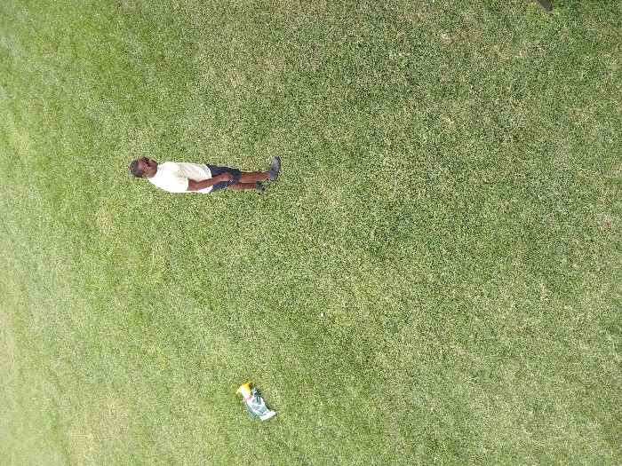 An aerial image captures a scene in Nakuru, Kenya. A single adult male, appearing to be of African descent, stands on a uniformly green, short-cut grass lawn. He is dressed in a light-colored short-sleeved t-shirt, dark shorts, dark shoes, and sunglasses. The man is positioned towards the right side of the frame, facing generally right, with his head turned slightly to his left. Several meters to his left, a crumpled item displaying yellow, green, and white colors rests on the grass. No other individuals, structures, or distinguishing landscape features are visible.