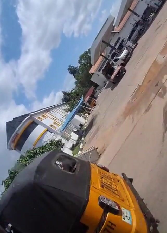The video appears to be shot from the perspective of someone riding in a motorized tricycle. It begins in front of a gas station with a building. The sky is visible with blue patches and white clouds. The tricycle then moves down a street, passing a light-colored building with a sign in front of it. Then, there are makeshift shops and vendors along the side of the road. People are seen walking on the side of the road. The video is shaky.
