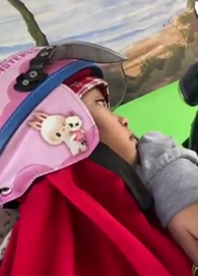 A young child, dressed in a red garment over a grey hoodie and wearing a pink helmet with bunny decorations and a red and white checkered head covering, is positioned in front of a backdrop that depicts a wintery mountain scene. The child's eyes move as they observe the surroundings, and at one point, they open their mouth. A portion of a black motorcycle is visible in the background.