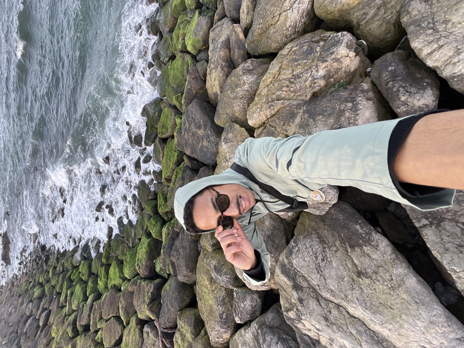 A male individual is depicted in a selfie taken at a rocky coastline in Tanger, Morocco