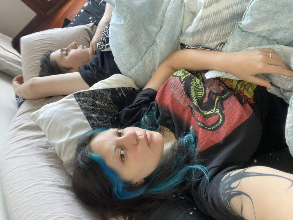 The image displays two individuals in a bed within an indoor, naturally lit environment, suggesting daytime. In the foreground on the left, one individual with dark hair, distinct turquoise blue streaks near the face, and bleached eyebrows looks directly at the camera with a neutral expression. This person wears a black t-shirt with a red and green graphic depicting a skeletal creature. A dark, possibly tribal-style, tattoo is visible on their upper left arm, and a simple silver-colored ring adorns their left ring finger. The second individual, situated in the background on the right, lies on their right side, facing away from the camera, with eyes closed, appearing asleep. They possess short dark hair and wear a black long-sleeved shirt with white patterns on the sleeve; their right arm is raised above their head. Both are covered by a light blue/grey textured duvet. White pillows with black intricate patterns support their heads, positioned against a light-colored, textured headboard or wall. A dark wooden surface is partially visible on the right side of the frame. The specific location within the city of Gijón/Xixón, Spain, cannot be determined from the visual information presented.