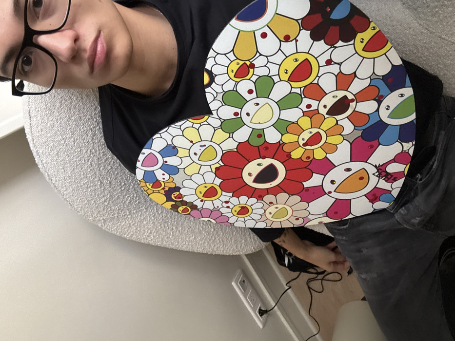 An individual is depicted seated in a light-colored, textured armchair within an indoor setting. This individual, a young adult wearing black-framed glasses, a black short-sleeved top, and dark grey jeans, looks directly towards the viewer with a neutral expression. They are holding a large, heart-shaped object adorned with a dense pattern of colorful, smiling flower motifs, characteristic of Takashi Murakami's "Superflat" style, featuring red, yellow, white, pink, green, blue, orange, and purple flowers, some with red droplet accents. Visible in the lower left background is a white wall featuring a Type E electrical outlet into which a black power cord is plugged, consistent with a location in Paris, France. A black bag or similar object is partially visible on the floor near the individual's left leg.