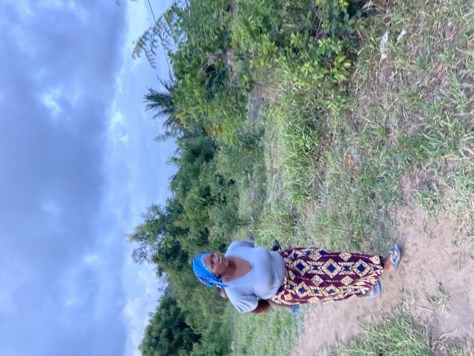 An outdoor scene in Dar es-Salaam, Tanzania, depicts an adult female walking from left to right on a dirt path