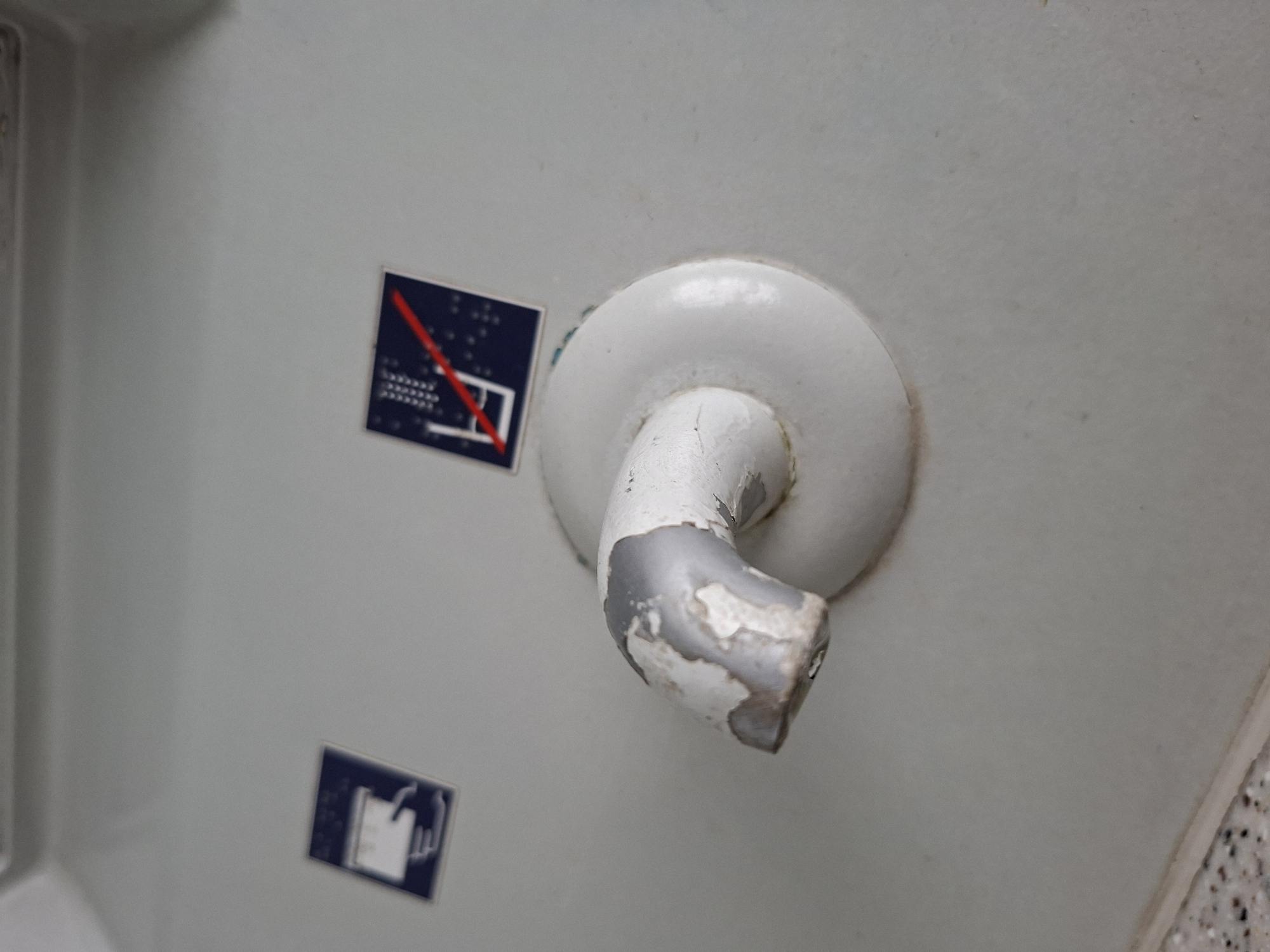 This image depicts a close-up, downward-angled view of a white, L-shaped metal water spout, positioned centrally against a light grey, smooth surface. The spout exhibits significant wear, with extensive chipping and peeling of its white paint, revealing a dark grey or metallic substrate underneath, particularly along its curved section. Rust or discoloration is visible at the base where the spout meets the grey surface. To the upper left of the spout, a square blue sticker with white iconography shows a hand under a flowing tap, indicative of a washing instruction. To the upper right, another square blue sticker displays a white icon of a drinking glass with a red diagonal line crossing through it, signifying "non-potable water" or "do not drink." This sticker also contains visible Braille text. The overall surface appears to be a section of a utility fixture or basin. The extreme lower left corner shows a fragmented view of a speckled, dark-toned surface, likely a countertop or floor. No people, specific actions, or interactions are visible. The scene is an unspecified interior location in the city of Unknown, Unknown.