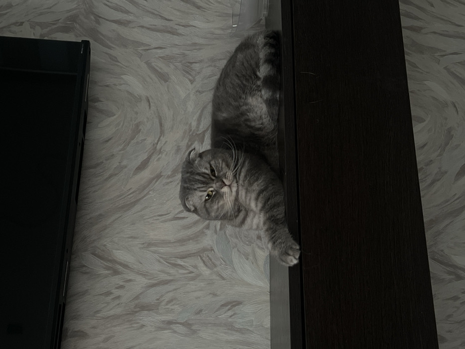 - "A grey tabby Scottish Fold cat with folded ears is depicted lying on a dark brown, flat surface, extending its left front paw forward" by FM-A5lOj2, licensed under CC BY 4.0