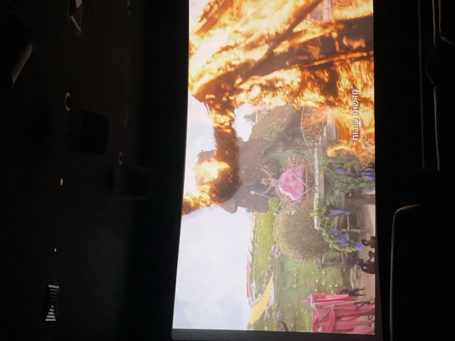A scene is displayed on a dark screen. A fiery explosion dominates the upper portion, descending toward a colorful, vibrant scene with a woman in a pink dress. A yellow brick road meanders through lush greenery and structures. Hebrew subtitles are visible on the right side of the screen. The overall setting appears fantastical or theatrical.