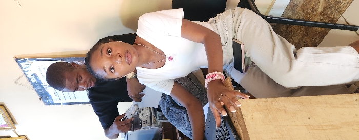 An indoor office or workspace in Jos, Nigeria, features two individuals. In the foreground, a young adult female with light brown skin and dark hair is seated at a light-colored wooden desk, facing forward. She wears a white short-sleeved top, light-colored trousers, a necklace with a pink pendant, multiple pink and white beaded bracelets on her left wrist, and a ring on her left ring finger. Her manicured hands rest near a black laptop keyboard. A dark smartphone with a light-colored case is visible on her lap. She is seated on a black metal stool. Behind her, a young adult male with dark skin and short dark hair is standing. He wears a black short-sleeved top and is engaged in an activity involving a grey and silver office machine, possibly a laminator or binding machine, while holding a piece of white paper. The background consists of a cream-colored wall. A blue poster or chart, partially visible with "Africa 2007" at the top, hangs on the wall behind the male. Two framed items are also visible higher on the wall to the left. A dark grey fabric item is draped over an object to the left of the male. The floor is tiled with a light brown pattern.