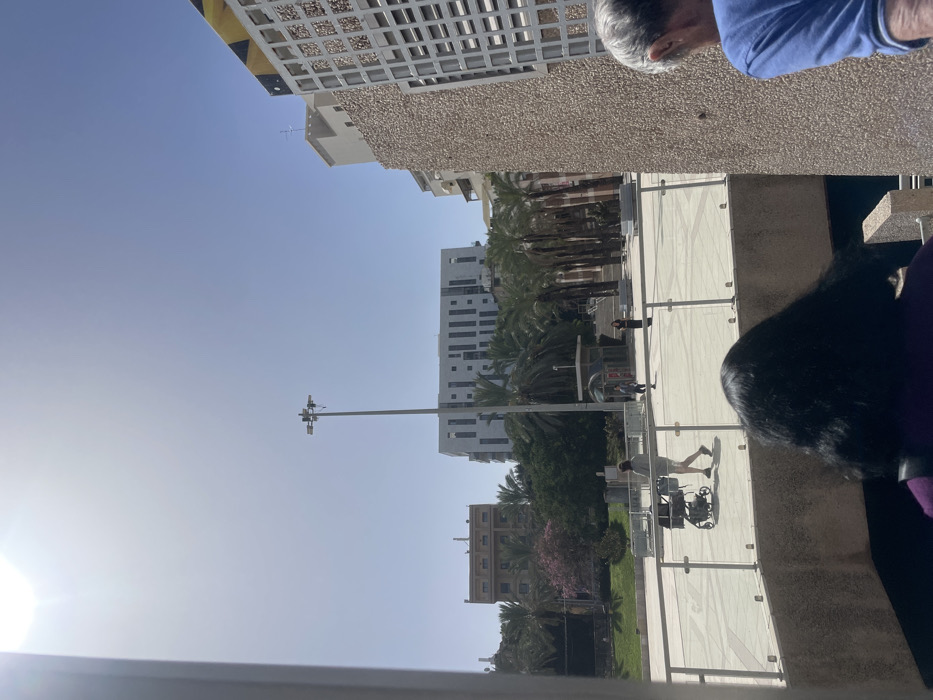 The image displays a sunlit urban plaza in Kfar Saba, Israel, identifiable as Kikar Rabin, with a view towards the city's older and newer architecture. In the immediate foreground, the top of a person's dark head is visible on the left, and the upper back and side of an older individual with grey hair, wearing a blue shirt, is on the right. A textured light brown concrete column partially frames the right edge of the frame. A glass and metal railing runs horizontally, separating the foreground from the plaza below a visible dark, recessed area. The midground features a large, light-colored paved plaza with geometric patterns. A person wearing light shorts and a light top is pushing a dark-colored baby stroller across the plaza, moving from left to right. Further back on the plaza, another person in dark clothing stands near a transparent structure with red elements, possibly a bus stop. A third person in dark clothing is seen walking away from the camera in the background of the plaza. A tall, grey light pole with multiple lamps at its apex stands centrally in the plaza. The background consists of green landscaping and buildings. Numerous palm trees and a tree with pink blossoms are visible between the plaza and the structures. To the left, an older, multi-story building with a light brown facade and rectangular windows, consistent with the Old Municipality building, is present. Behind the light pole and palm trees, a modern, multi-story white building with vertical dark window strips and balconies is visible. On the far right, parts of other buildings are seen, including one with a distinctive square-patterned facade and another with a textured stone wall. The sky is clear and bright blue, with a strong sun glare emanating from the upper left.