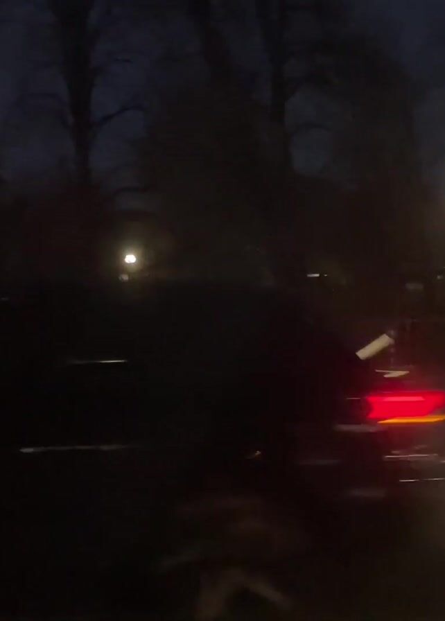 street at night. It appears to be dusk or dark, illuminated by streetlights. A dark car drives by. There is a fence and some trees in the background. The street is wet and reflects light.