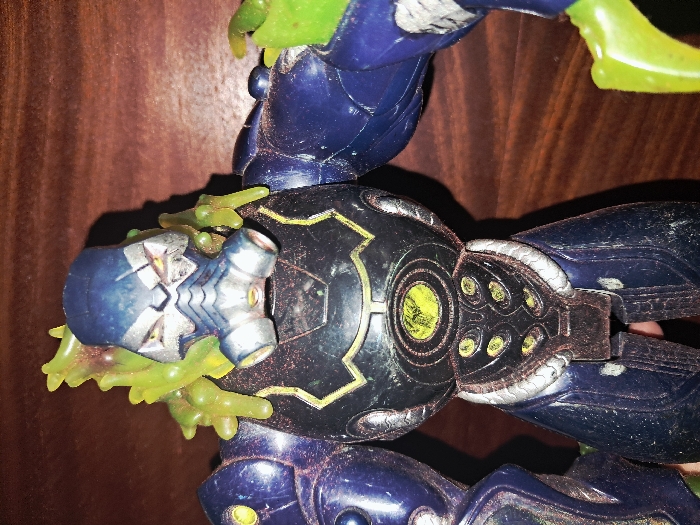 A close-up, vertically oriented photograph captures a weathered action figure standing static against a blurred, reddish-brown wooden background with visible grain, located in Juan Griego, Venezuela. The figure is predominantly dark blue and black, featuring a helmet-like head with a silver gas mask-style faceplate, yellow eyes, and angular silver markings above the eyes. Translucent, lime-green organic-appearing growths emanate from around the figure's head, shoulders, and limbs. The chest is covered by a black plate with yellow electrical or bio-mechanical patterns and a central luminous yellow circular element. The abdominal section is also black, detailing multiple smaller yellow oval-shaped components. Dark reddish-brown particulate or weathering is observed across the figure's surface, particularly on the chest, midsection, and legs. No interactions are occurring.