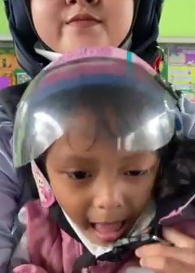 In a close-up, selfie-style video, an adult and a child are shown wearing helmets while likely seated on a motorcycle or scooter