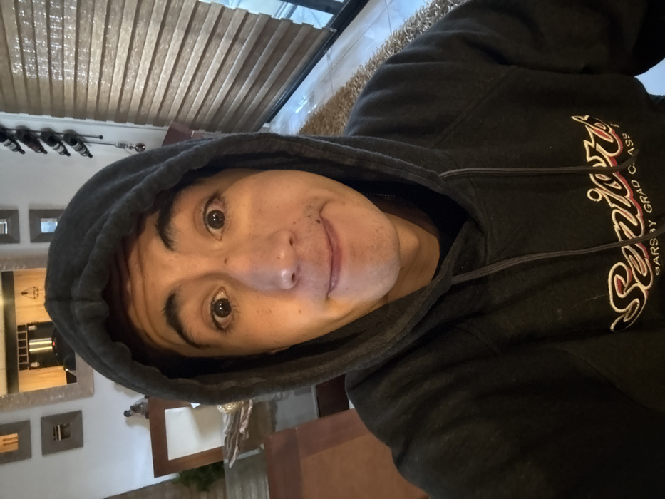 A close-up selfie captures a male individual positioned centrally within an indoor residential environment. The subject, a young adult with dark eyes, presents a neutral facial expression with a slight upward curve at the corners of the mouth. He is wearing a dark grey hooded sweatshirt with the hood drawn over his head. The chest of the sweatshirt displays an embroidered text, partially visible as "SENIORS YEARS BY GRAD CLASS." The background on the viewer's left features a partial view of a dining area, including a light-colored tabletop and a wooden chair. A large, ornate-framed mirror hangs on the wall, reflecting an adjacent interior space with overhead pendant light fixtures and dark cabinetry. Several smaller framed items are arranged around the main mirror. On the viewer's right, a large window is covered by light brown horizontal blinds. A wall-mounted wine rack holding several bottles is affixed to the wall next to the window. A light-colored, textured rug is visible on the floor in the lower right portion of the frame. The setting indicates a domestic interior. The exact location within Santa Clara Ocoyucan, Mexico, is not visually identifiable from the image.