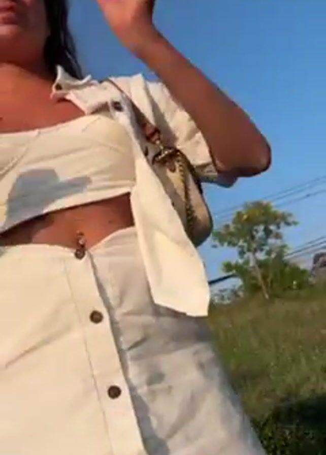 A young woman with wavy brown hair and sunglasses stands in front of a grassy hill against a clear blue sky. She wears a white two-piece outfit consisting of a cropped tank top and a button-down skirt, paired with a matching button-down shirt and a small, patterned purse slung over her shoulder. Her navel piercing is visible. She poses, adjusting her hair and smiling at the camera.