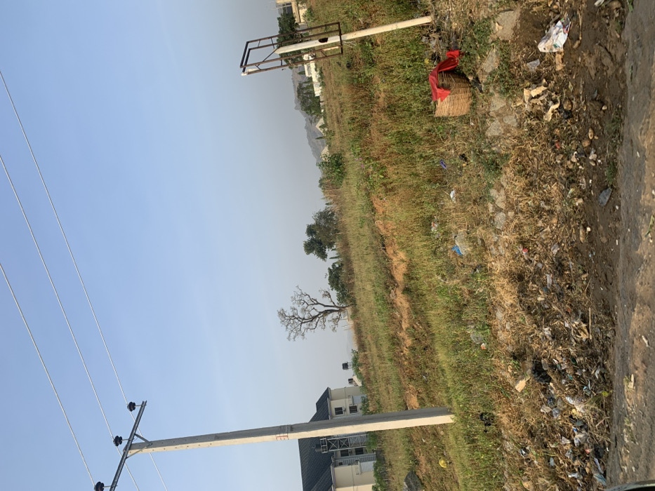 A grassy field meets a dirt path, marred by scattered trash. A wicker basket with a red cloth sits in the field. Buildings appear in the distance, along with trees. A utility pole stands tall, wires stretching into the clear sky. The scene suggests a blend of rural and developed environments.