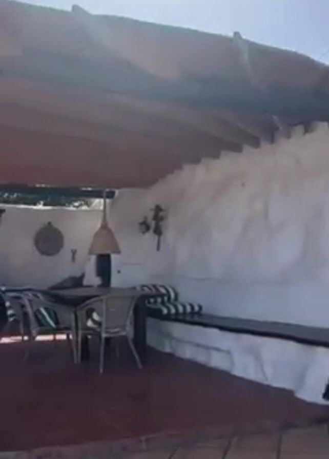 sunny outdoor patio area with a white building in the background. The building has the number "15" displayed next to the door. The patio is decorated with a cactus in a pot, a covered dining area with a table and chairs, and a white bench. There are also palm trees and a mountain visible in the distance under a clear blue sky. The ground is covered with brown tiles.