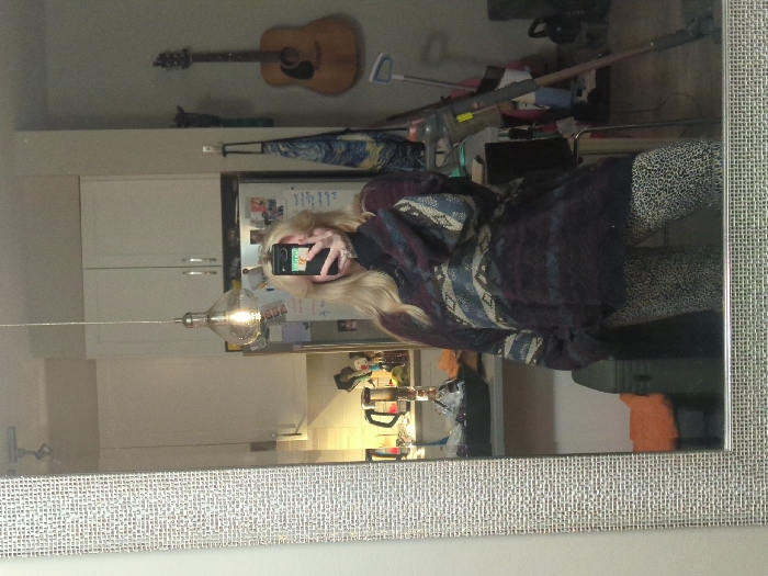 The image depicts an indoor scene, observed through a mirror reflection, stated to be located in Area D (Elaho/Garibaldi), Canada. A single individual with long blonde hair, whose face is obscured by a dark-colored smartphone held in their right hand, is positioned centrally, capturing a self-portrait. The individual wears a loose-fitting, patterned pullover sweater featuring geometric designs in shades of dark purple, blue, beige, and maroon, paired with animal-print leggings or pants. A ring is visible on the fourth finger of their left hand. The background, viewed in reflection, presents a domestic environment. To the viewer's left, a kitchen area is visible, containing white upper cabinets with silver handles, a stainless steel refrigerator adorned with multiple magnets, and a counter holding items including a black bowl, a kettle, and various utensils. A clear glass pendant light with an exposed filament bulb hangs from the ceiling in the mid-ground. An orange fabric item is partially visible on a lower surface in this area. To the viewer's right, an acoustic guitar with a light wood finish hangs on a neutral-colored wall, alongside a blue, white, and yellow patterned fabric suspended from a hook. A cordless stick vacuum cleaner leans against a wall or furniture to the right of the individual, and a dark green storage container is visible on the floor. The mirror itself features a textured, silver-colored frame.