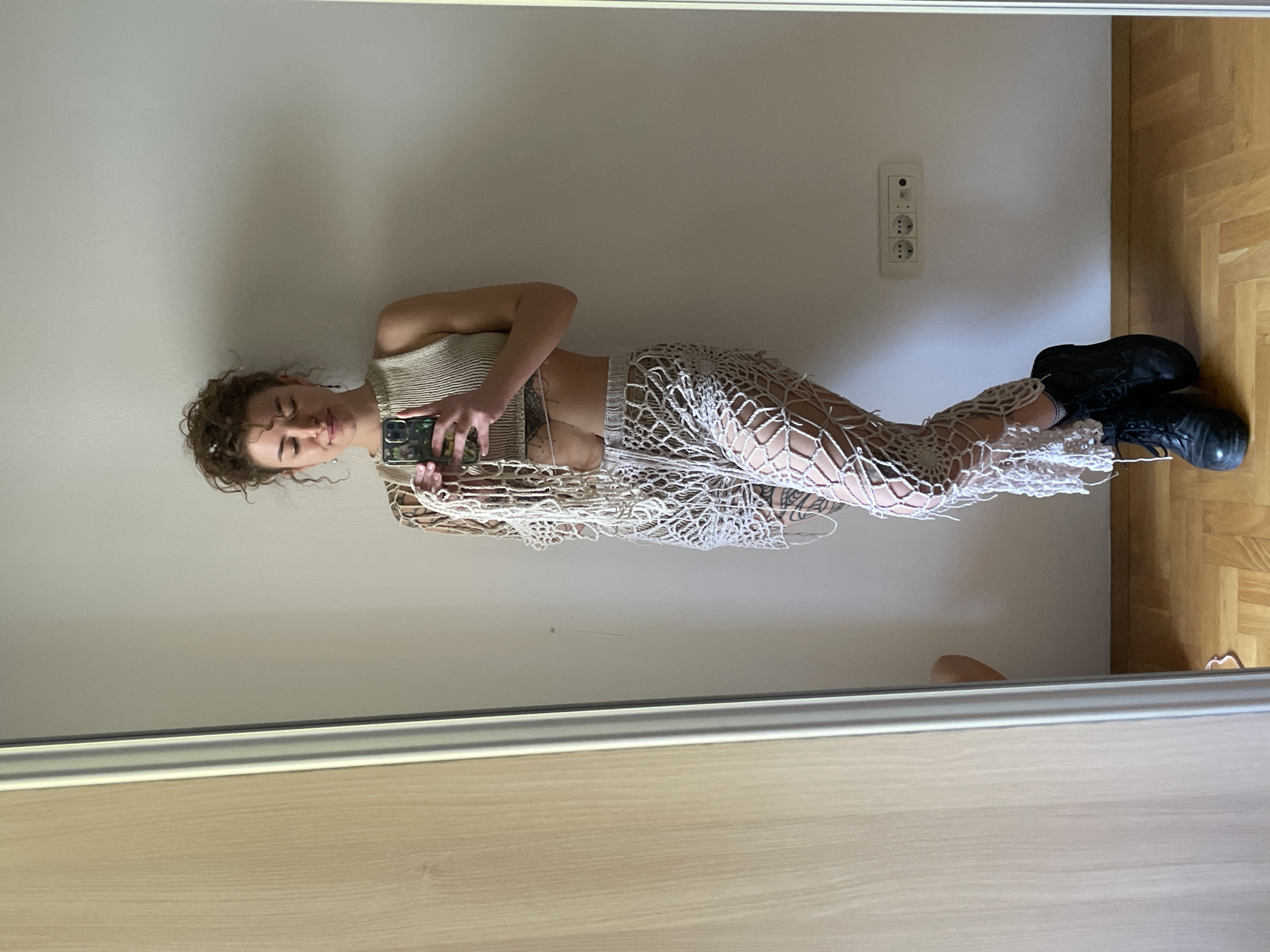 A full-length mirror reflects a woman indoors. She has curly hair and holds a cell phone, presumably taking the picture. She is wearing a striped tank top and a white, mesh-like garment covering her lower body and upper thighs. She also wears black boots. A wall with an electrical outlet is behind her, and a wooden floor is visible on the right side of the image. The location is not identifiable as Boreti, Montenegro, from the provided image.