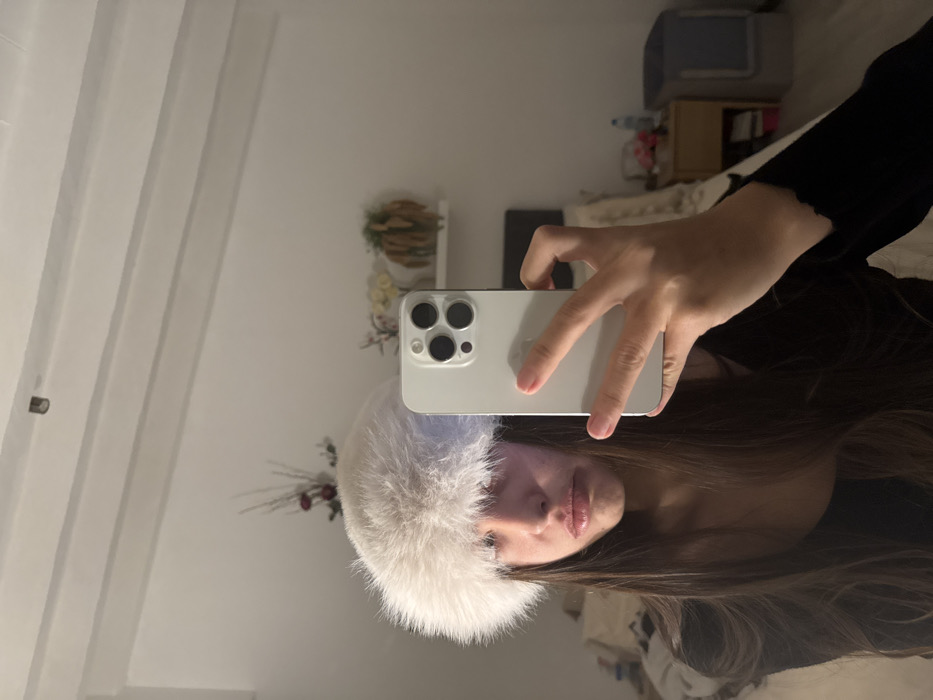 The image captures a mirror selfie of a lone female subject within an indoor residential setting, consistent with a bedroom
